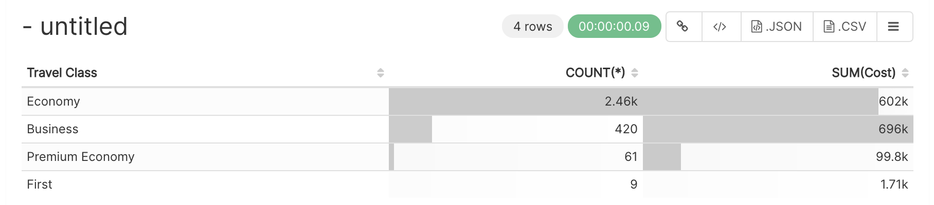 In this section, we'll create a table visualization to show the number of flights and cost per travel class.